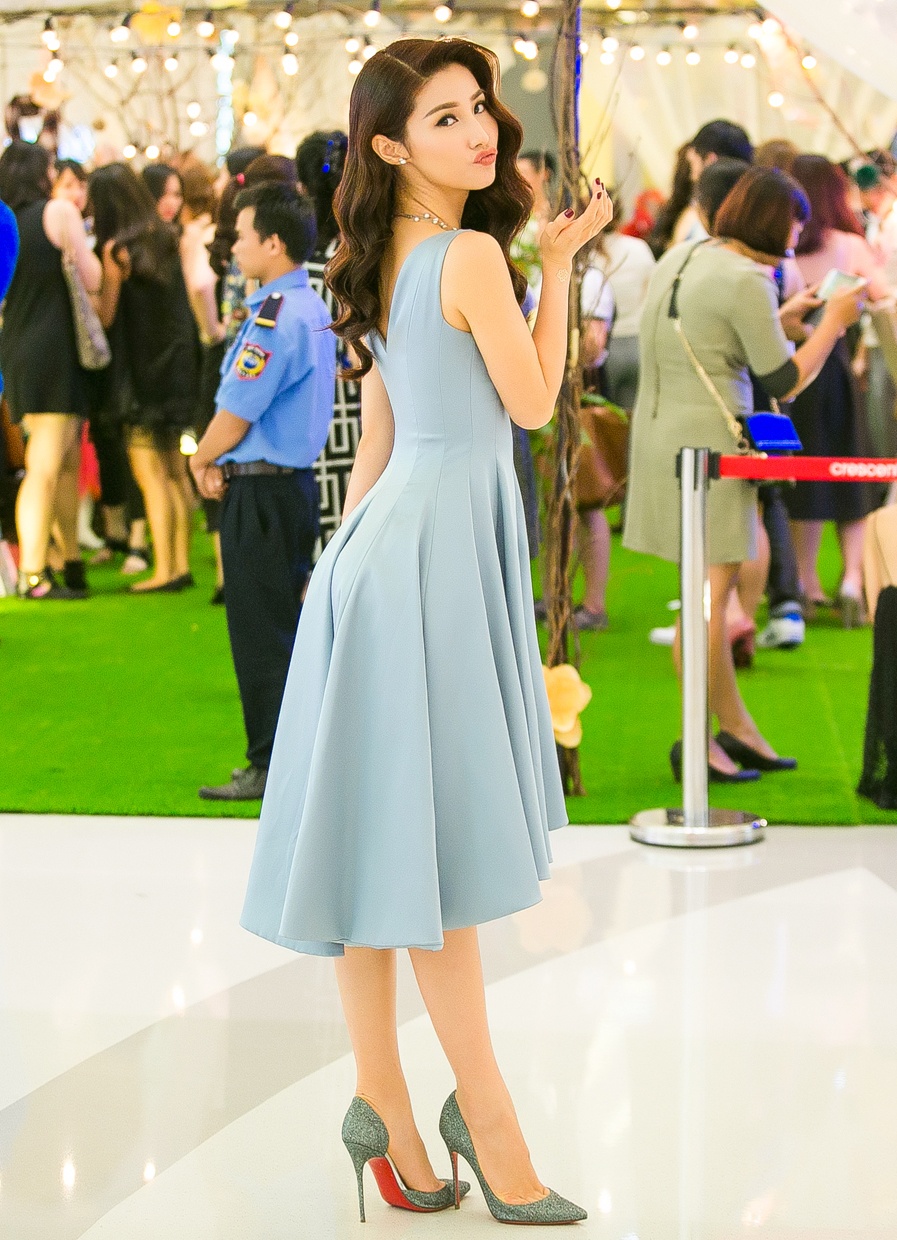 | Tối 24/9, Diễm My 9X tham gia sự kiện khai trương nhãn hàng thời trang tại TP HCM. Người đẹp Tốc độ và đường cong nổi bật ở buổi tiệc với phong cách nhẹ nhàng, nữ tính. Cô diện đầm tông xanh phom cổ điển, màu da trời mát mắt. Mái tóc xoăn thập niên 1970 ăn nhập trang phục. |