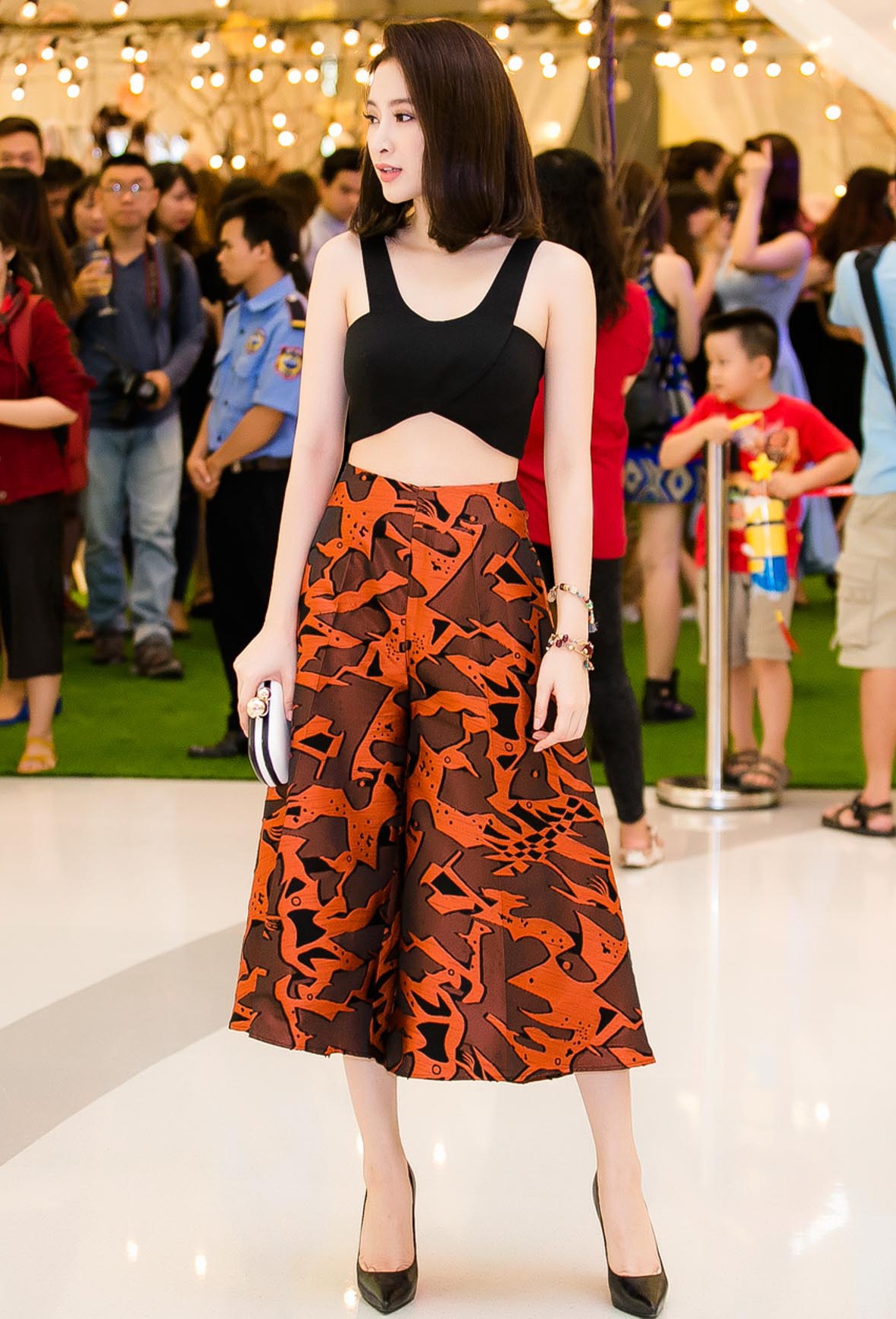 | Khác hình tượng lộng lẫy mọi khi, Phương Trinh chọn trang phục đơn giản nhưng không kém phần gợi cảm của NTK Kim Khanh. Thiết kế áo crop-top ngắn, quần suông rộng phù hợp vóc dáng người đẹp phim Biết chết liền. |