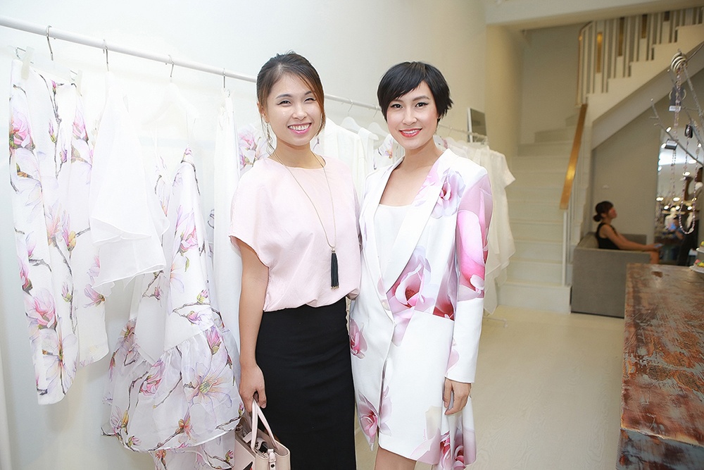 | Á hậu Trương Thị May diện đầm dự tiệc họa tiết hoa sắc hồng trang nhã, ăn nhập với không gian buổi khai trương. |