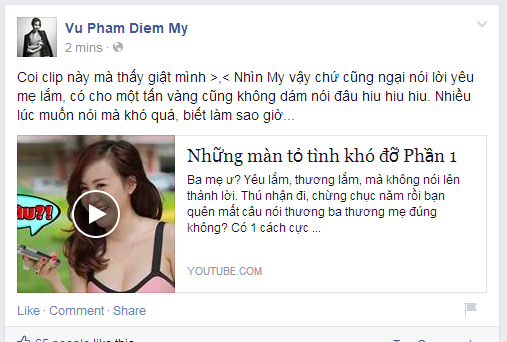 Khi được xem trải nghiệm khó khăn của các bạn, Diễm My ngay lập tức khẳng định trên Facebook: “Coi clip này mà thấy giật mình. Nhìn My vậy chứ cũng ngại nói chuyện sến súa lắm. Có cho 1 tấn vàng cũng không làm đâu. Nhiều lúc muốn nói mà khó quá, bỏ qua luôn”.
