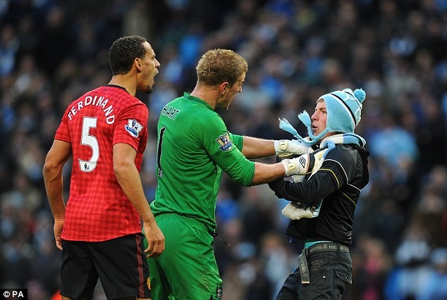 | Joe Hart can ngăn một CĐV Man City tấn công Rio Ferdinand. |