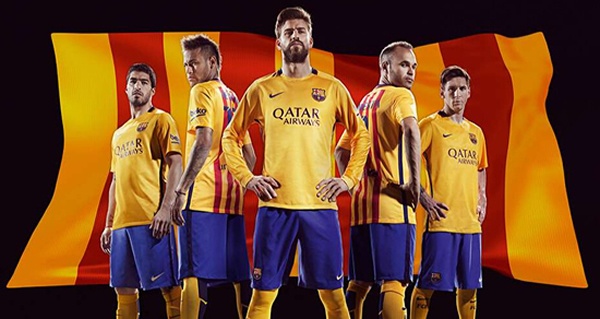 Theo Daily Mirror, áo đấu của Barcelona 2015/2016 là sự kết hợp giữa kiểu áo của Celtic và Ranges, hai đối thủ kình địch tại Scotland. Các đường kẻ màu xanh tím và đỏ thẫm truyền thống ở thân áo được đổi từ chiều dọc thành chiều ngang. Hai bên hông áo là màu cờ xứ Catalunya. Trong khi màu quần cũng có sự thay đổi, từ xanh tím sang đỏ thẫm. Mẫu áo sân khách của các học trò HLV Luis Enrique mang màu vàng chủ đạo. Sau lưng là 4 sọc đỏ lớn chạy dài từ cổ xuống chân áo. Đây cũng là màu cờ xứ Catalunya.