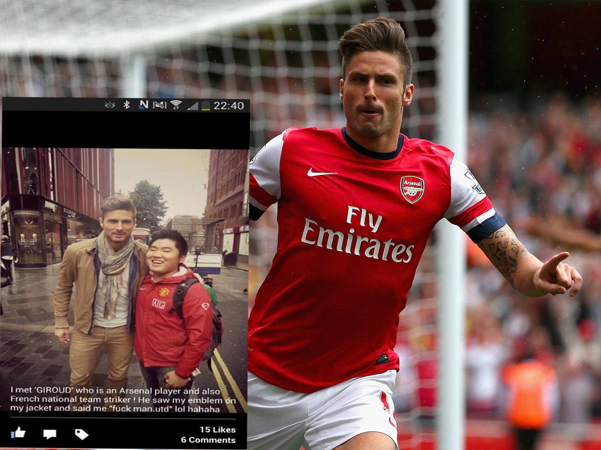 Một CĐV MU đã phải hứng chịu những từ khiếm nhã sau khi đăng tải bức hình chụp với tiền đạo Giroud của Arsenal lên mạng xã hội Facebook. Tuy nhiên, nhiều người cho rằng đây là một sản phẩm photoshop mà người ai đó cố tình tạo ra nhằm châm ngòi cho cuộc chiến vốn đầy hiềm khích giữa MU và Arsenal.