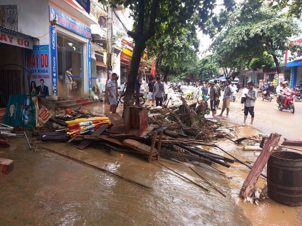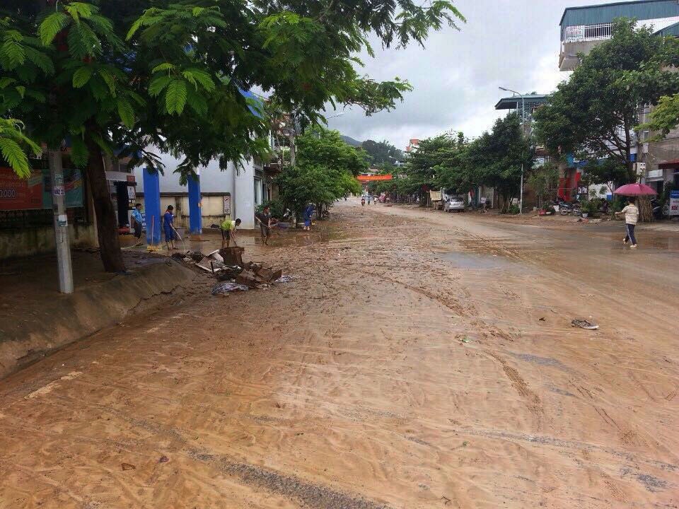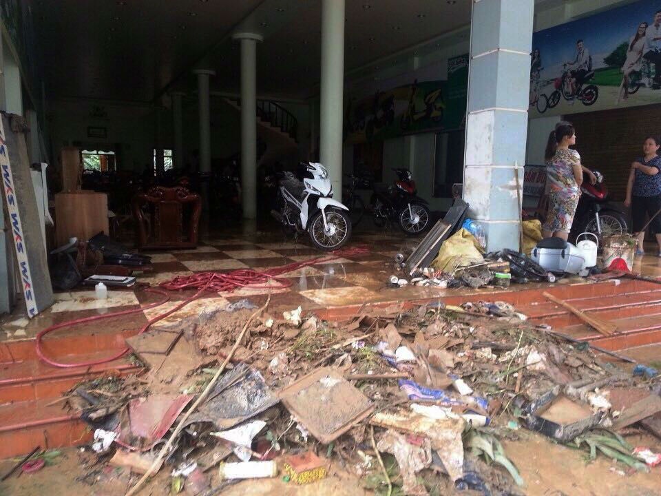 Khi lũ ống rút, nhiều xe máy, bàn ghế, tài sản của người dân thị trấn Tuần Giáo (Điện Biên) nằm ngổn ngang ngoài đường.