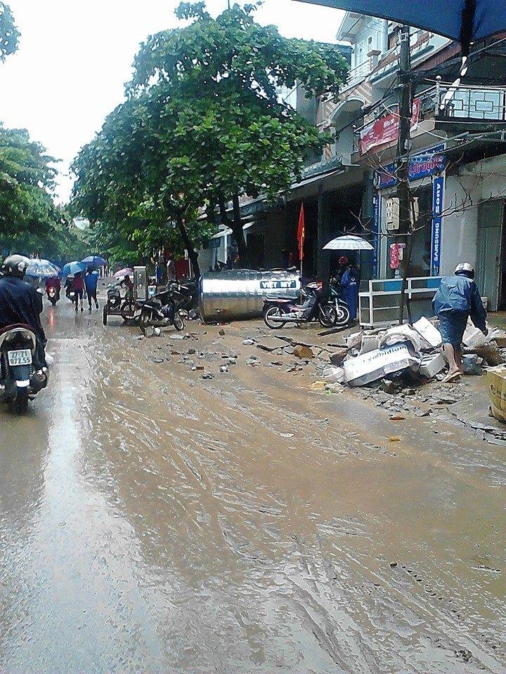 | Bàn ghế, biển quảng cáo, cành cây ngập đường. Ảnh: Hoàng Thành. |