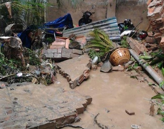| Rạng sáng 1/8, hồ cá tại khe suối Huổi Củ (Tuần Giáo, Điện Biên) vỡ bờ nhân tạo. Nước tràn theo khe xuống phá tường một cửa hàng kinh doanh thuộc khu Tân Tiến cuốn theo hơn 50 xe máy. Ảnh: Hoàng Thành. |