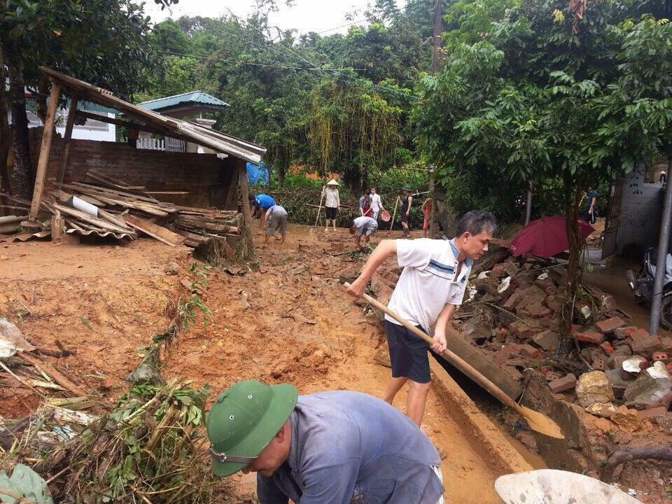 | Người dân khu Tân Tiến thu dọn bùn đất, vật dụng gia đình sau lũ ống. Ảnh: Độc giả Phạm Ngọc Khoa. |