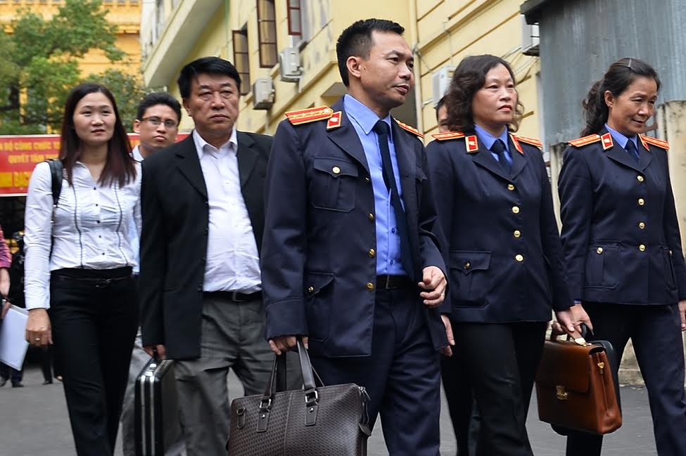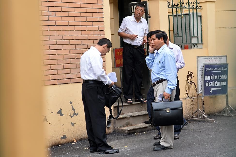 Các luật sư, người có liên quan đến vụ án làm thủ tục trước khi vào bên trong. Theo cáo trạng, có 9 bị can bị truy tố các tội: Cố ý làm trái quy định của Nhà nước, Lừa đảo chiếm đoạt tài sản, Trốn thuế, Kinh doanh trái phép.