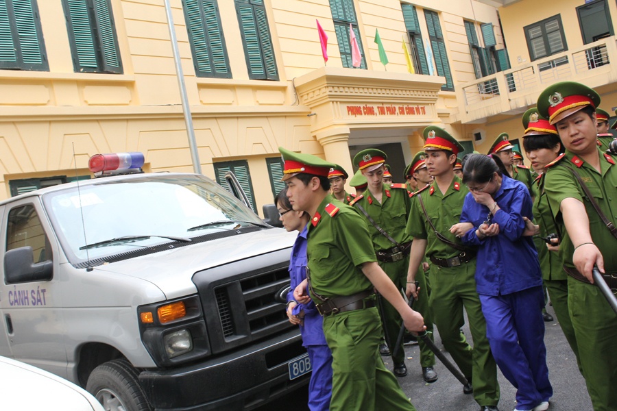 Một trong 8 bị cáo có mặt tại tòa vẫy tay người thân trước khi được áp giải lên xe.