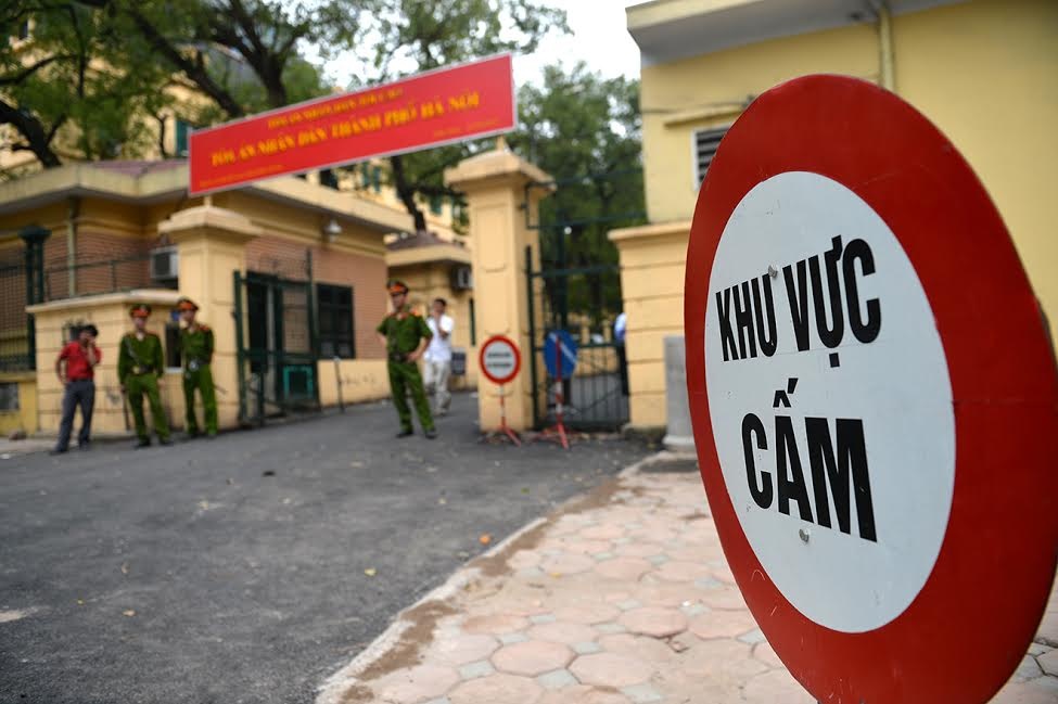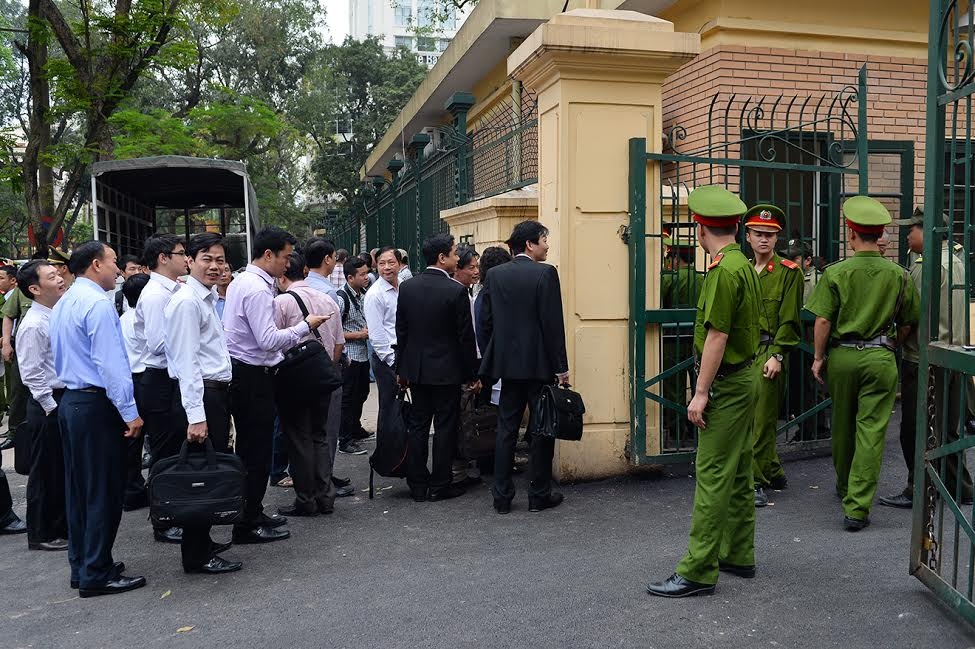 Hơn 6h ngày 16/4, hệ thống an ninh trước cổng tòa Hà Nội nằm trên phố Hai Bà Trưng (quận Hoàn Kiếm) siết chặt để chuẩn bị cho phiên xét xử bầu Kiên cùng các đồng phạm.