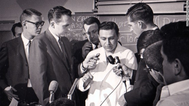 Bác sĩ Tom Shires, người xử lý vết thương của Kennedy, nói chuyện với các nhà báo trước 13h. Ảnh: Dallas Morning News.