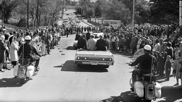 Dân chúng đổ ra hai bên đường khi đoàn xe của tổng thống tiến về trung tâm thành phố Dallas. Các nhân viên Nhà Trắng ngồi trên một xe bus ở khá xa xe chở tổng thống. Ảnh: Dallas Morning News..