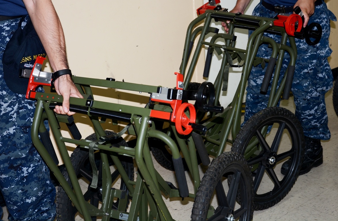 | Từ bãi đáp máy bay ở đuôi tàu, các nạn nhân được đưa lên xe chuyên dụng. Sau đó, qua hệ thống các thang máy, những người này sẽ được chuyển đến trung tâm y tế. |