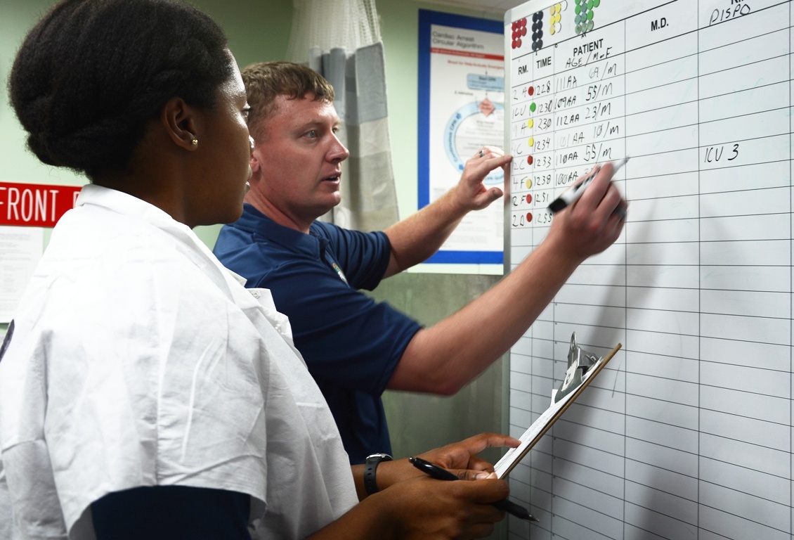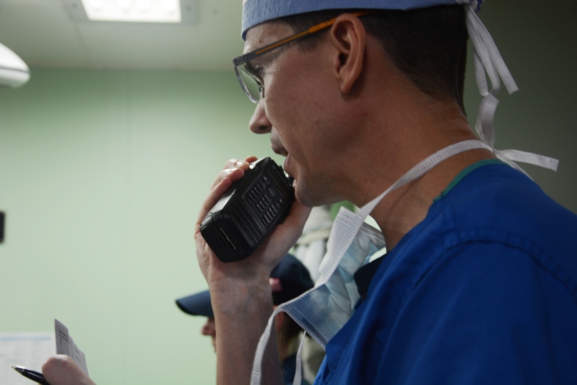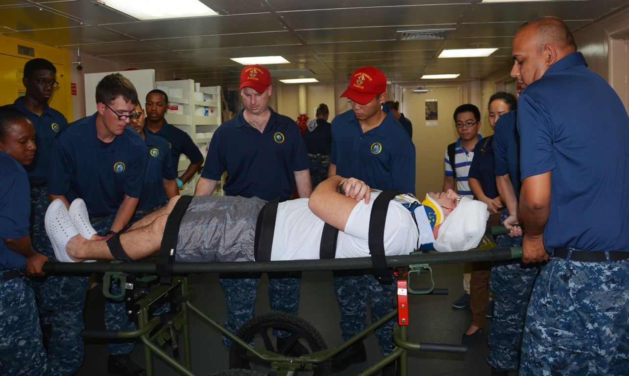 | Ở trên tàu, dưới sự chỉ huy của thiếu tá Melanie Merrick (sĩ quan phụ trách Trung tâm điều trị y tế), tất cả nhân viên được báo động trong tư thế sẵn sàng. Phương tiện và thiết bị cũng được đưa đến những vị trí đã định để phục vụ cho việc khám và điều trị bệnh nhân. |