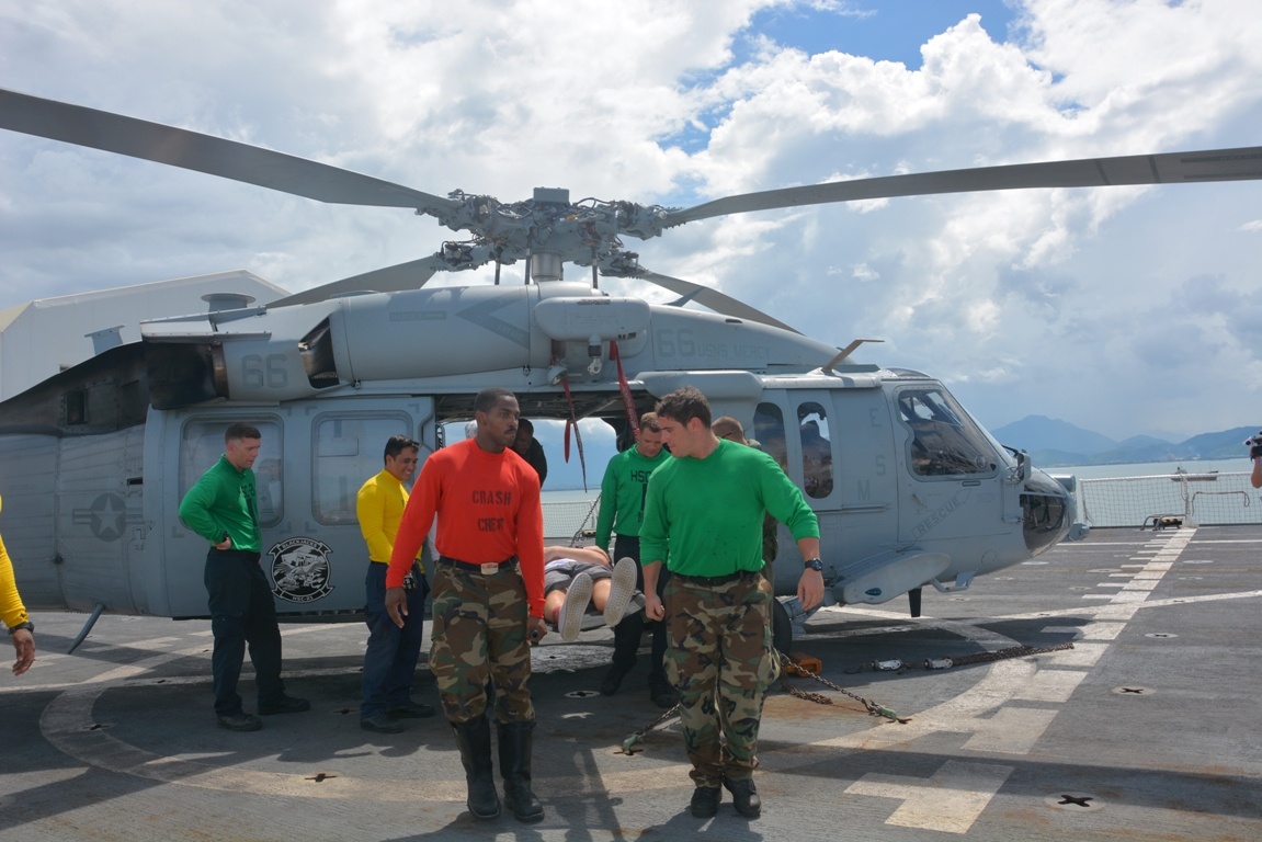 | Các bác sĩ của Hải quân Mỹ kịp thời có mặt đưa những người bị thương lên trực thăng để về tàu USNS Mercy điều trị. |