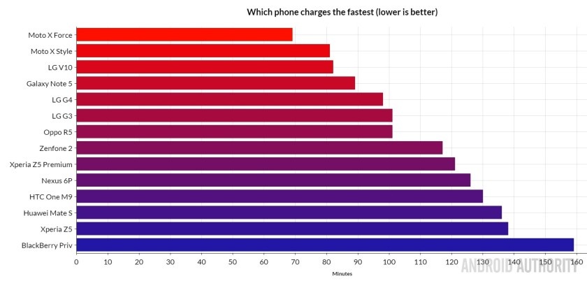 Top 3 smartphone có thời gian sạc nhanh nhất là Moto X Force, Moto X Style và LG V10. 3 smartphone sạc chậm nhất là Huawei Mate S, Sony Xperia Z5 và BlackBerry Priv.