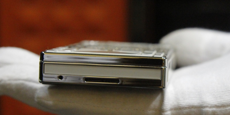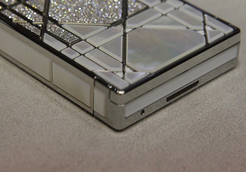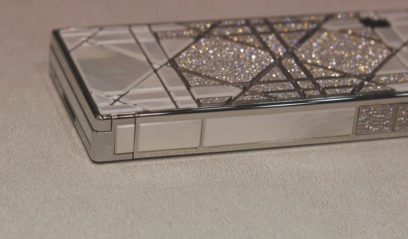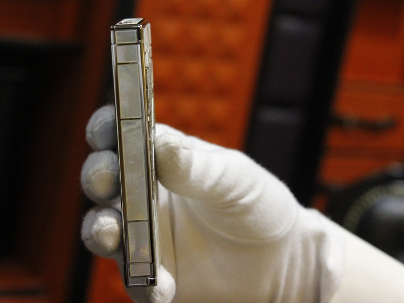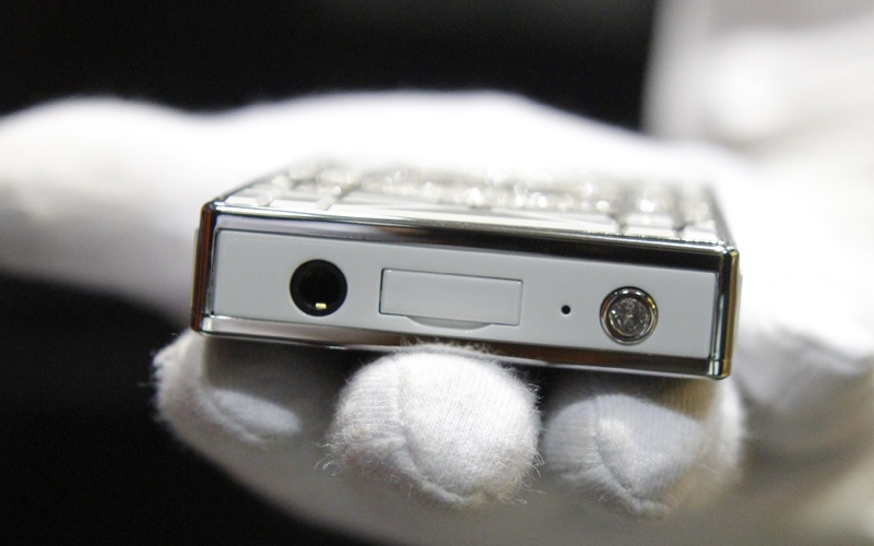 Phía bên cạnh trái, 2 phím tăng, giảm âm lượng của máy được đính 112 viên kim cương, điểm xuyết bởi khảm trai.