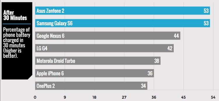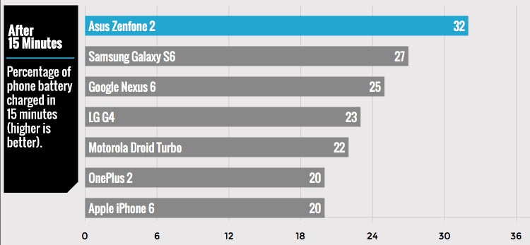 Bất kỳ điện thoại nào tích hợp tính năng sạc nhanh đều có thể sạc đầy pin trong trên dưới 2 tiếng hoặc ít nhất 20% trong 15 phút. Asus Zenfone 2 sạc được nhiều nhất trong 15 phút và Galaxy S6 sạc nhiều nhất trong 30 phút. S6 đều đạt mức pin 80% và 100% nhanh nhất trong các thiết bị được kiểm tra, dù vậy, nó chỉ dùng pin dung lượng 2.550mAh còn phần lớn đều từ 3.000mAh trở lên. Đó là lý do vì sao TomsGuide đánh giá Asus Zenfone 2 cao hơn Galaxy S6 về tốc độ sạc.
