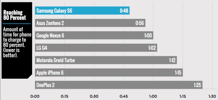 Galaxy S6 tỏa sáng khi chạm mốc 80% pin chỉ trong 48 phút, nhanh hơn 20 phút so với mức trung bình và hơn 40 phút so với điện thoại sạc chậm nhất, OnePlus 2. Asus Zenfone 2 đứng sau với 56 phút. Đây là hai thiết bị duy nhất sạc được 80% trong chưa đầy 1 tiếng.