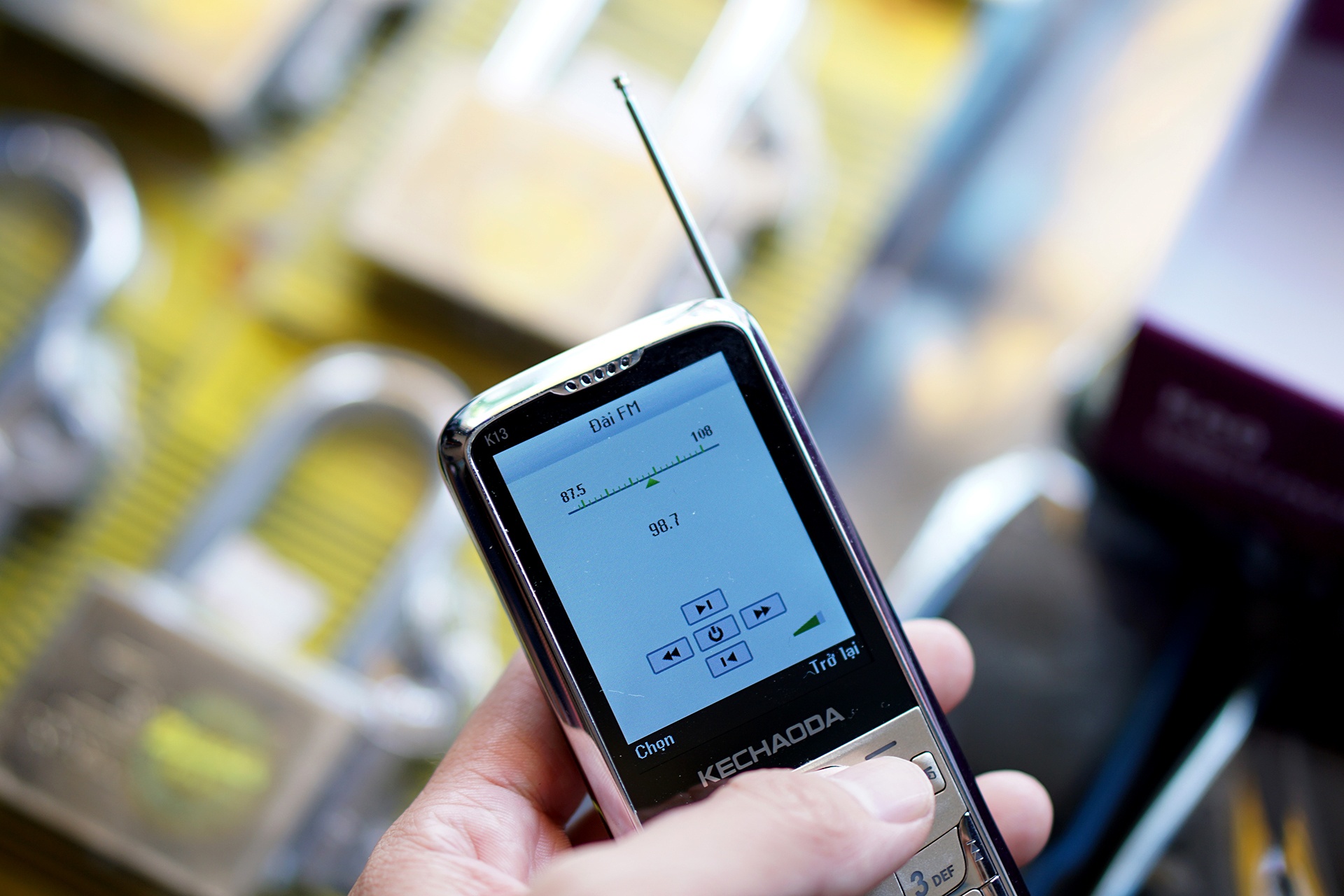 Model này có ăng-ten để nghe F.M radio. Theo chủ cửa hàng, máy giá rẻ và hỗ trợ nhiều SIM nên khá hút khách.