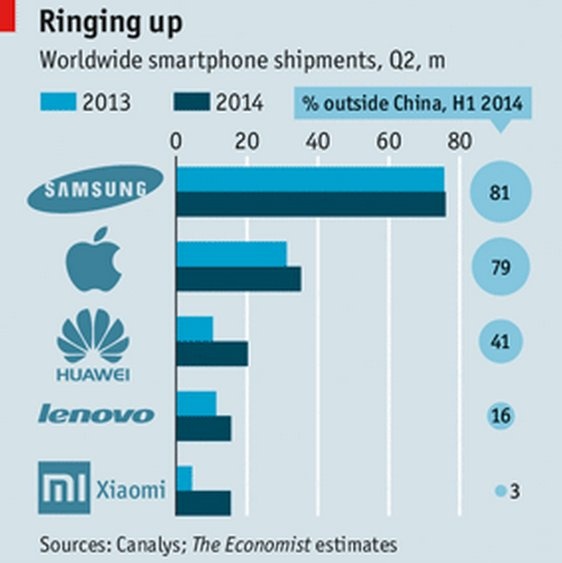 8 trong tổng số 10 nhà sản xuất smartphone lớn nhất tại Trung Quốc đến từ trong nước. Xiaomi - một startup (công ty khởi nghiệp) chuyên bán hàng online đã vượt mặt Samsung để trở thành nhà sản xuất lớn nhất tại Trung Quốc với 15,4 triệu máy bán ra. Hãng này dự kiến sẽ bán 60 triệu máy trong năm 2014 và 100 triệu máy trong năm 2015.