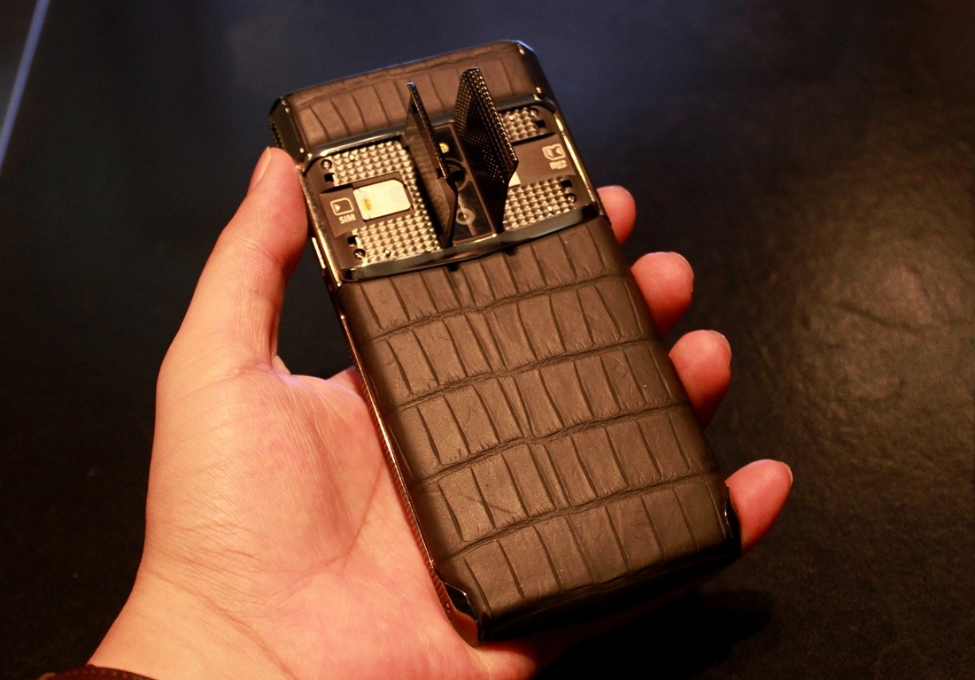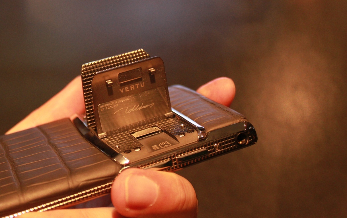 | Vertu thiết kế nắp SIM và thẻ nhớ dạng "cánh chim", mở và đóng bằng cách xoay nút theo từng chiều khác nhau. |