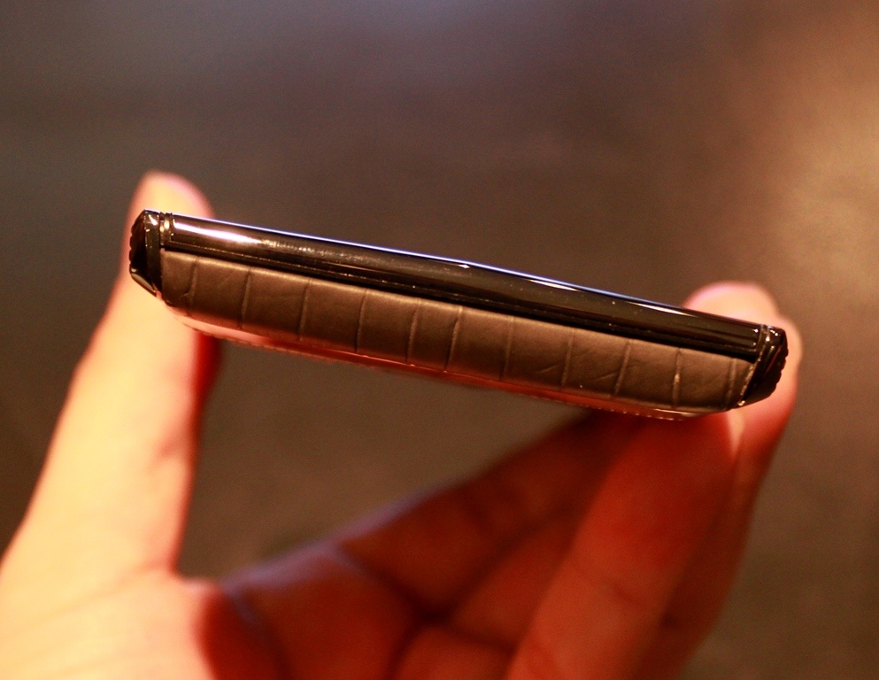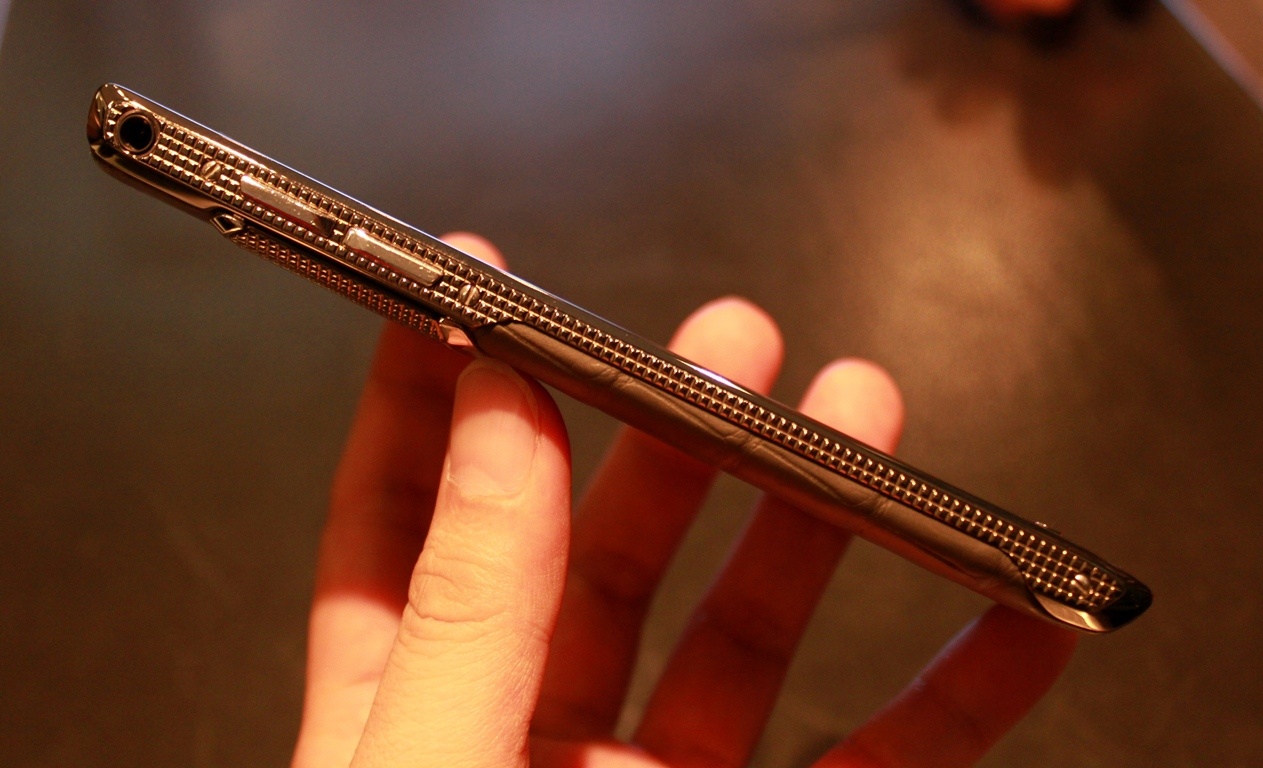 | Khung máy được làm bằng titan cấp độ 5, viền trên được khắc chữ V. Đây là những chi tiết đặc trưng của Vertu. |