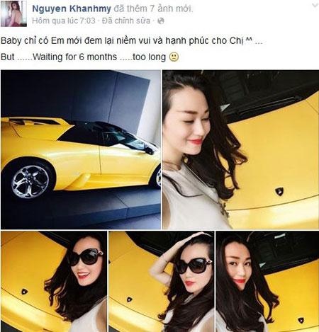Giữa tháng 12/2014, Khánh My lên trang mạng xã hội cá nhân khoe hình ảnh chụp chung với chiếc xe Lamborghini Murcielago Roadster và viết status như sau: “Baby chỉ có em mới đem lại niềm vui và hạnh phúc cho chị. But waiting for 6 months… too long”.