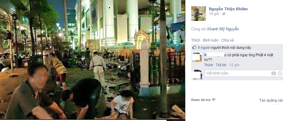 19h ngày17/8, một vụ nổ lớn xảy ra gần đền Erawan, một đền thờ Hindu khá nổi tiếng tại Thủ đô Bangkok, Thái Lan làm hơn 20 người chết và 80 người bị thương. Thông tin gây hoang mang khách du lịch đang có mặt ở đất nước chùa vàng. Trên mạng xã hội, nhiều du khách và người nhà bày tỏ sự lo lắng.