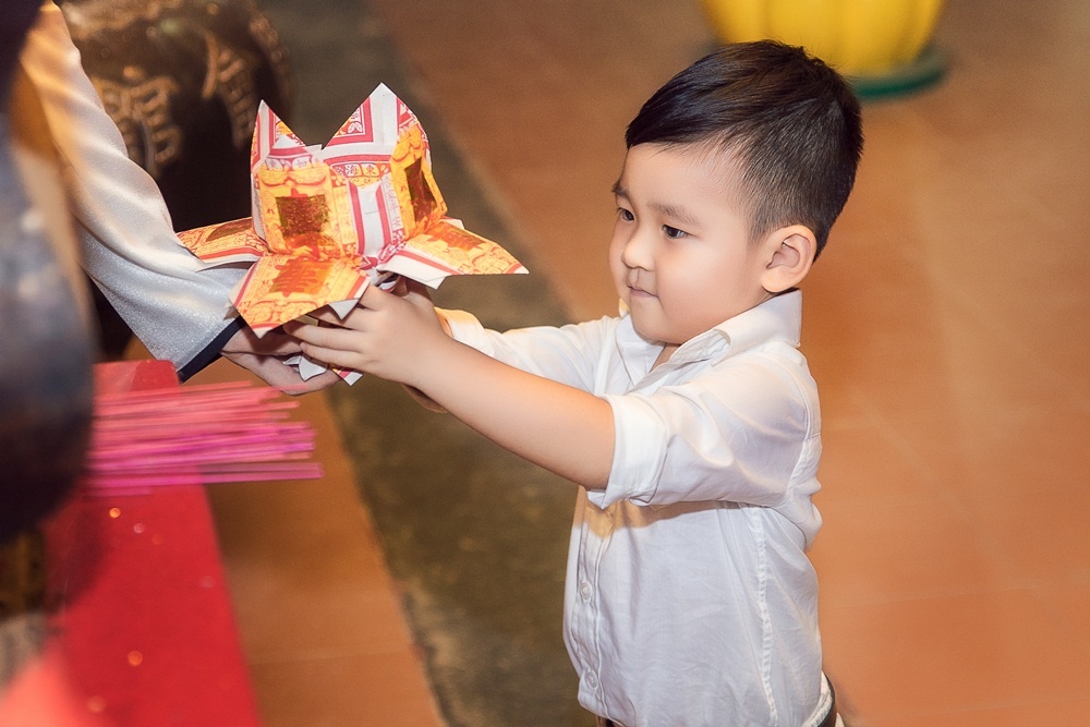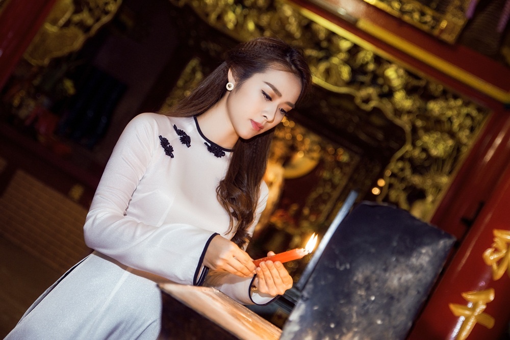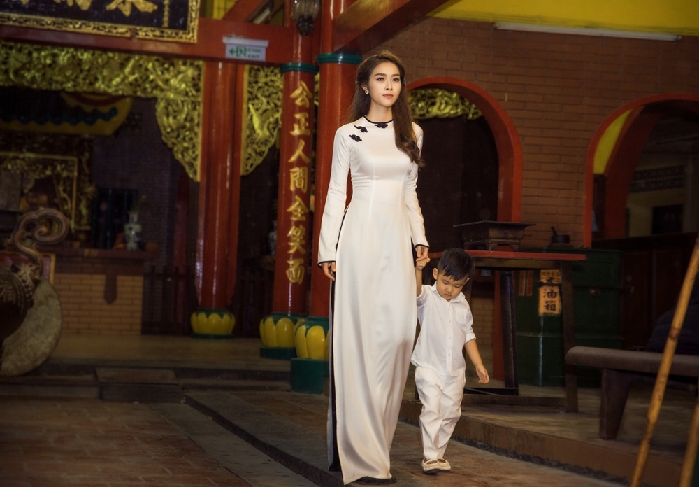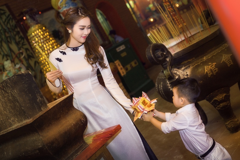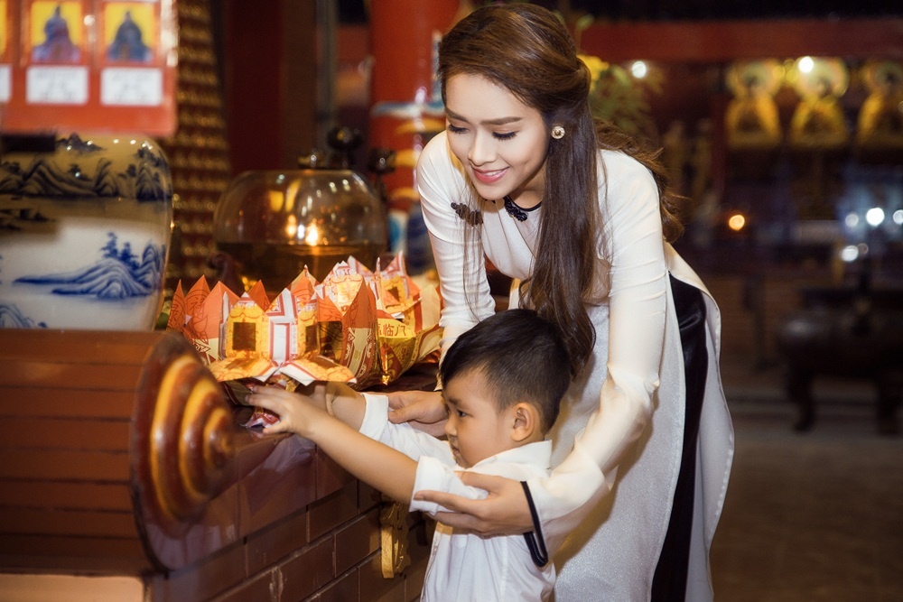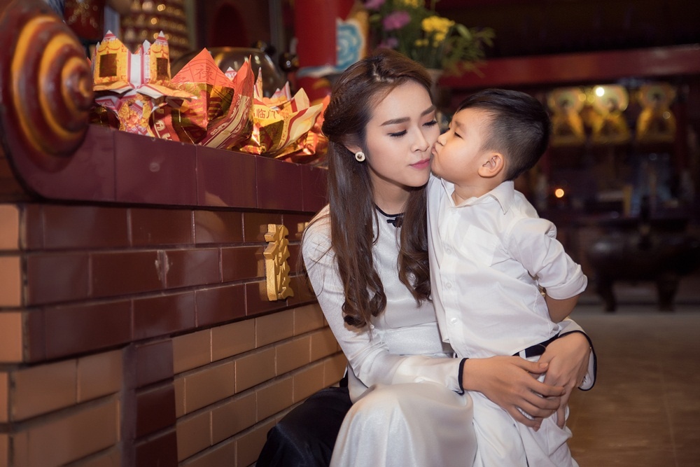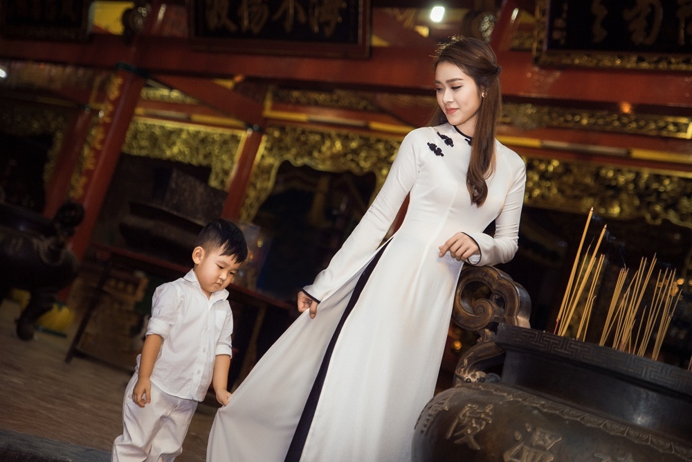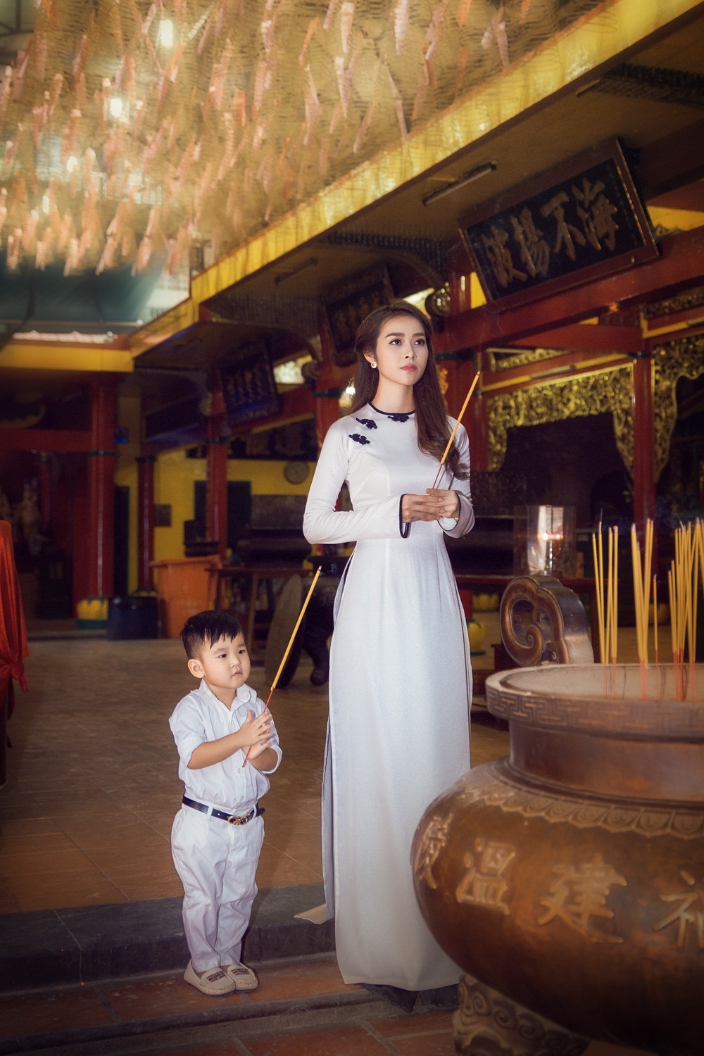 | Minh Khang thắp hương cùng mẹ. Nhóc tỳ được diện trang phục tông trắng đồng điệu với áo dài tinh khôi của nữ diễn viên 22 tuổi. |