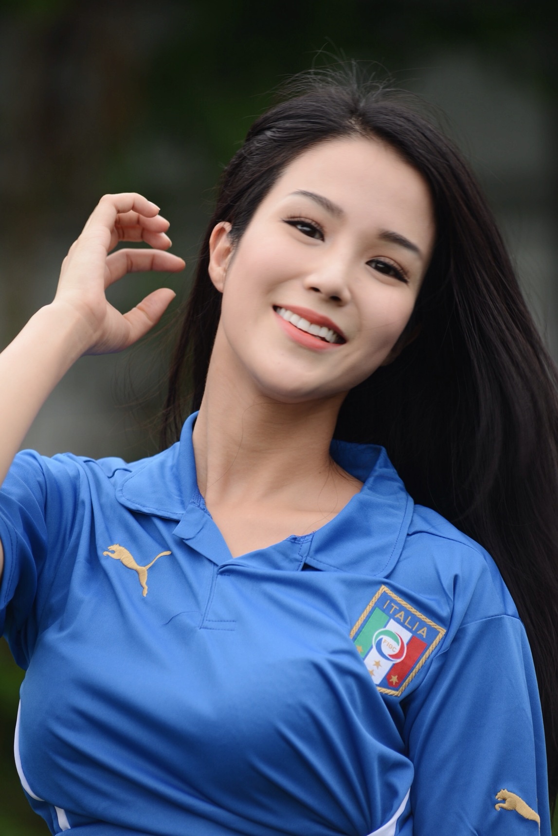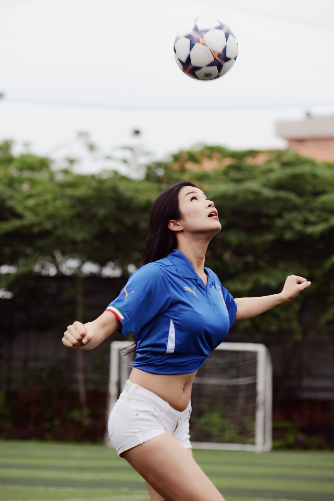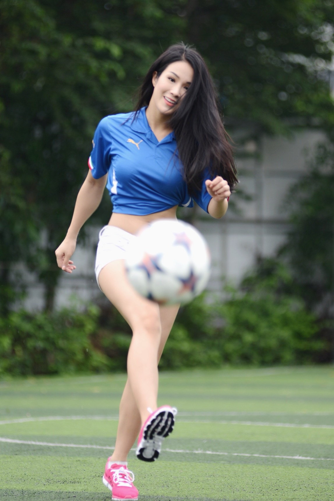 Quán quân 'Cuộc đua kỳ thú 2013' mặc trang phục đội tuyển Ý năng động, khoe vòng hai thon gọn, săn chắc.