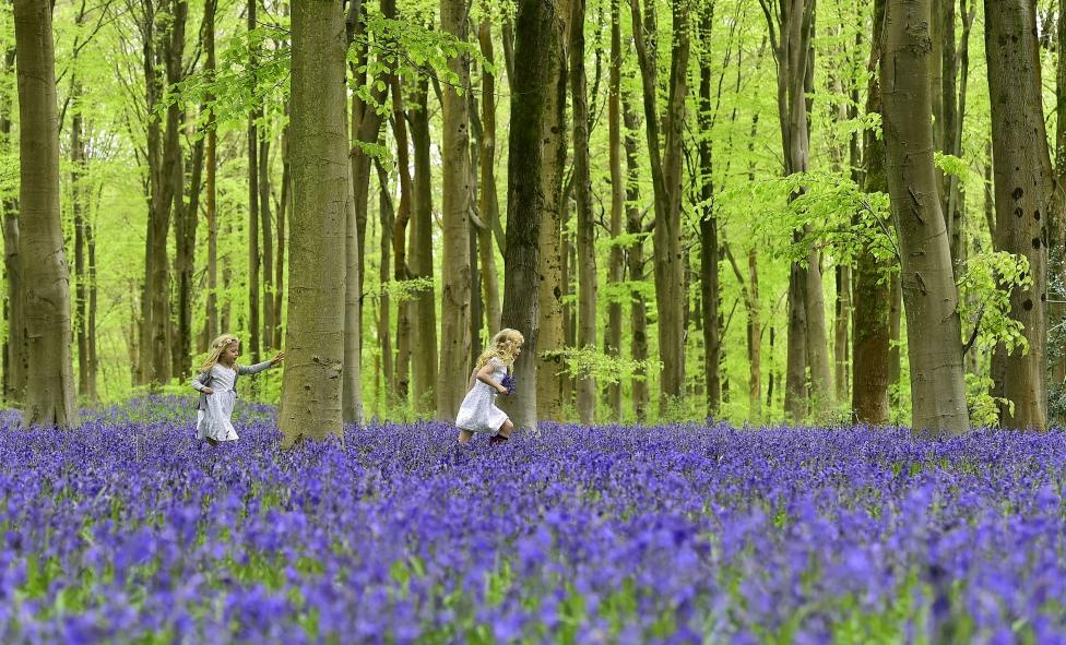 Hai bé gái nô đùa trong cánh rừng phủ đầy hoa ở BlueBells gần Marlborough, miền nam nước Anh, hôm 4/5. |