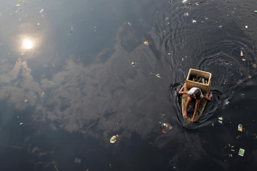Một phụ nữ mưu sinh bằng nghề lượm rác trên con sông ô nhiễm nặng ở thành phố Navotas, Philippines, ngày 6/5. |