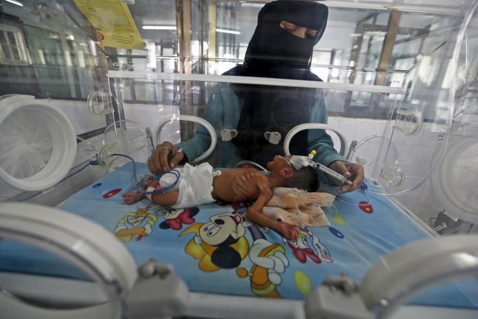 Bác sĩ chăm sóc một đứa trẻ sinh suy dĩnh dưỡng ở thủ đô Sanaa, Yemen, ngày 7/5. Tình trạng khan hiếm lương thực và nhiên liệu trong những tuần gần đây khiến nhiều người lâm vào cảnh đói khát. |