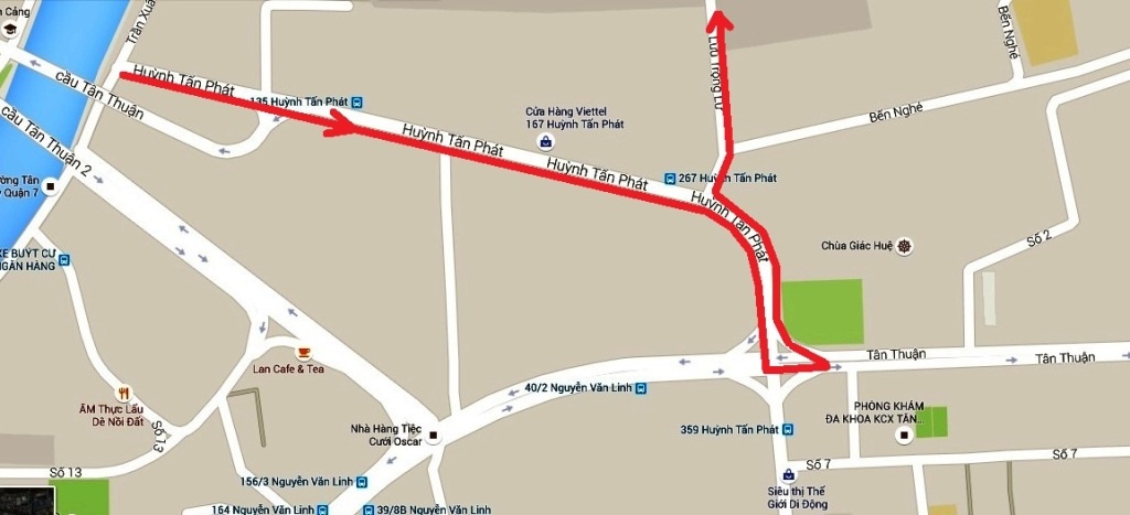 Lộ trình thay thế: Trần Xuân Soạn → rẽ phải vào đường Tân Thuận 4 → đi về hướng đường Nguyễn Văn Linh → đường Huỳnh Tấn Phát.