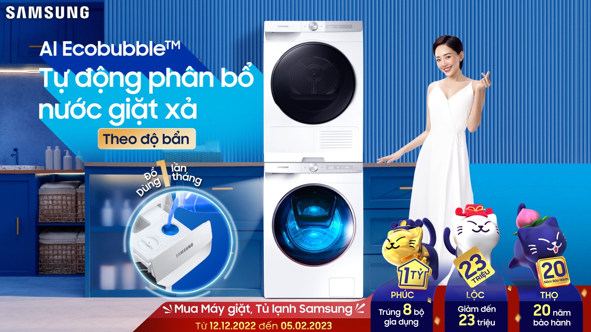 Từ 12/12/2022 đến 5/2/2023, Samsung triển khai chương trình khuyến mại Tết. Người dùng mua máy giặt thông minh Samsung AI Ecobubble có cơ hội trúng quà hấp dẫn đến 1 tỷ đồng. Độc giả tham khảo thông tin chi tiết tại đây.