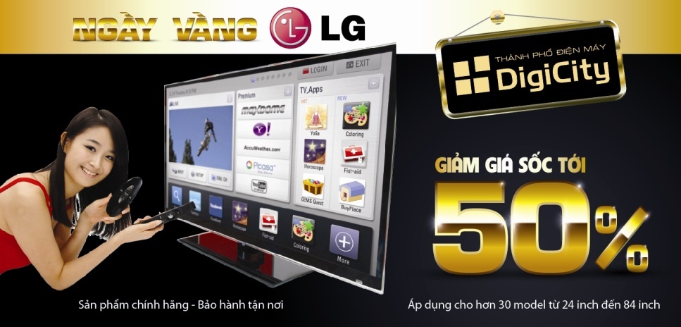 Trong chương trình Ngày vàng TV LG, DigiCity giảm giá tới 50% hơn 30 mẫu TV bán chạy nhất, kích thước từ 24 inch đến 84 inch, nhiều chức năng và giá tiền phù hợp với từng mục đích sử dụng. Đây là thời gian tốt nhất để khách hàng mua các dòng sản phẩm TV chính hãng, thế hệ mới, hiện đại, trang bị nhiều công nghệ thông minh (kết nối internet, 3D, các tính năng thú vị), với mức giá vô cùng phải chăng. Chi tiết chương trình xem tại đây.