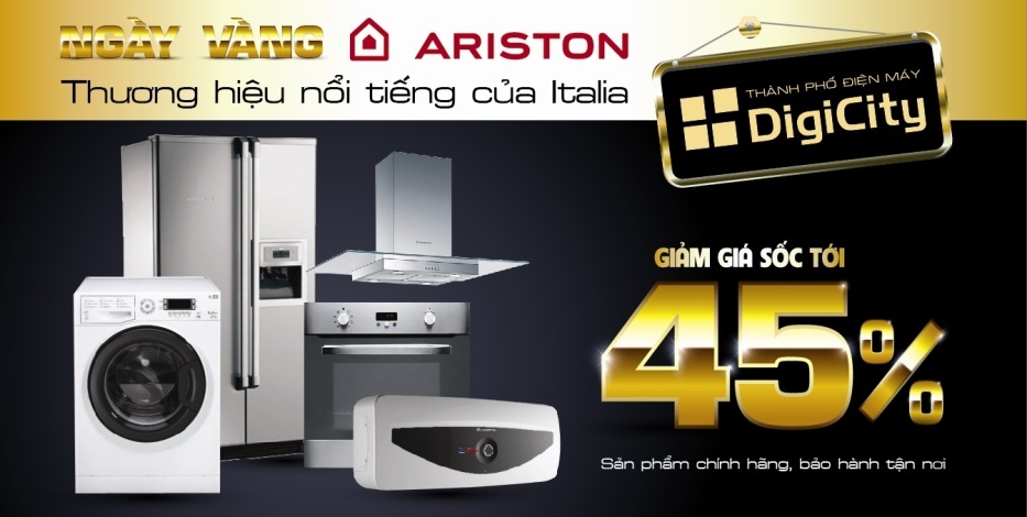 Ariston là thương hiệu nổi tiếng với các sản phẩm công nghệ Ý. Trong chương trình ưu đãi Ngày vàng Ariston, DigiCity giảm giá 45% đối với gần 40 mẫu sản phẩm gia dụng cao cấp, như bình nóng lạnh, máy sấy, máy giặt, lò nướng, hút mùi, tủ lạnh… Chi tiết chương trình xem tại đây.