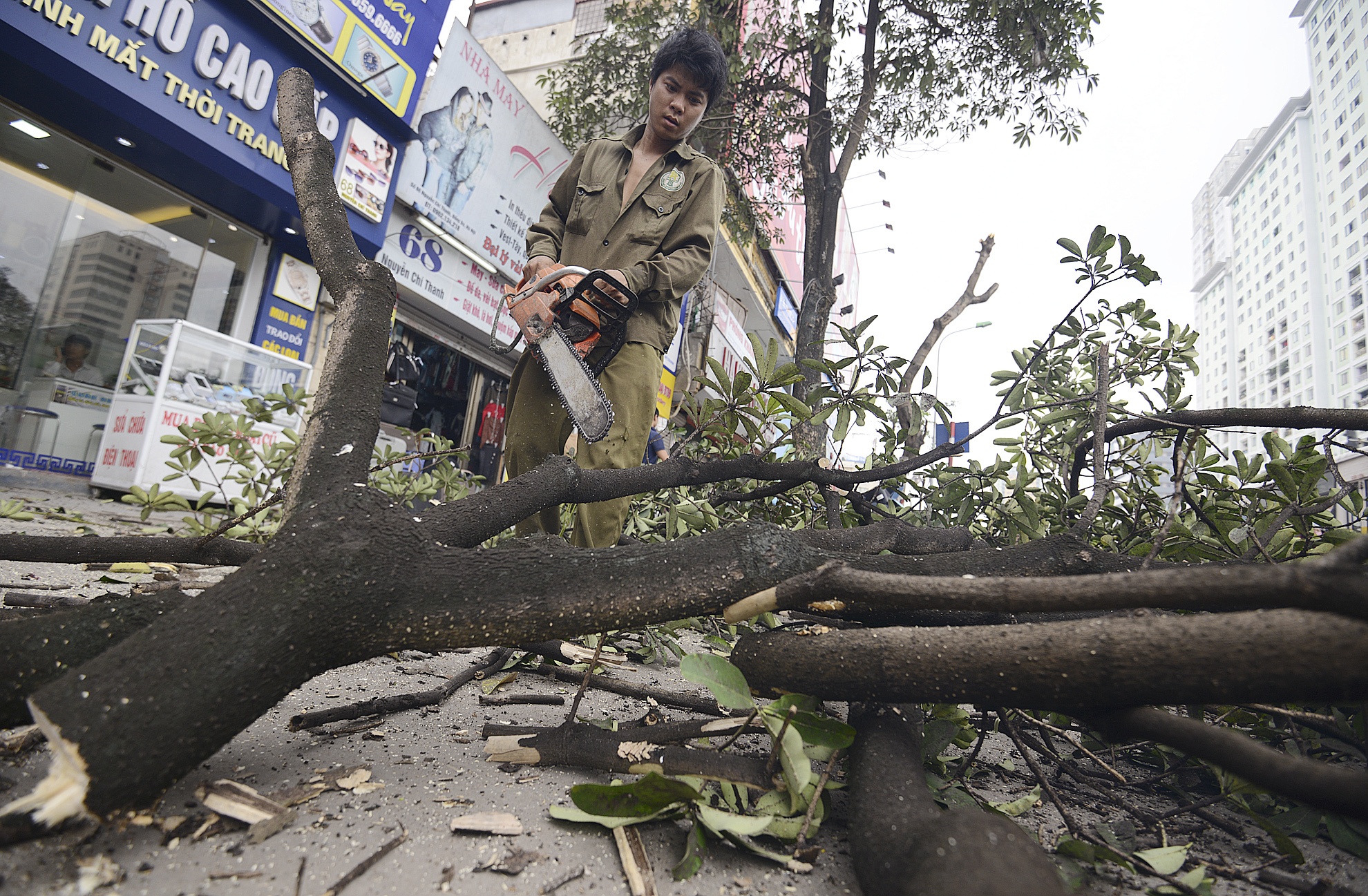 | Công nhân Công ty Công viên cây xanh chặt hạ cây hoa sữa trên đường Nguyễn Chí Thanh, Hà Nội. Ảnh: Lê Hiếu |