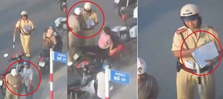 | Sau khi bị chặn dừng, người đàn ông này đã đi ra một góc chuẩn bị và quay lại dúi vào tay anh CSGT. Anh CSGT dùng tập hồ sơ che lại rồi cho vào túi áo ngực. (Ảnh cắt từ clip). |