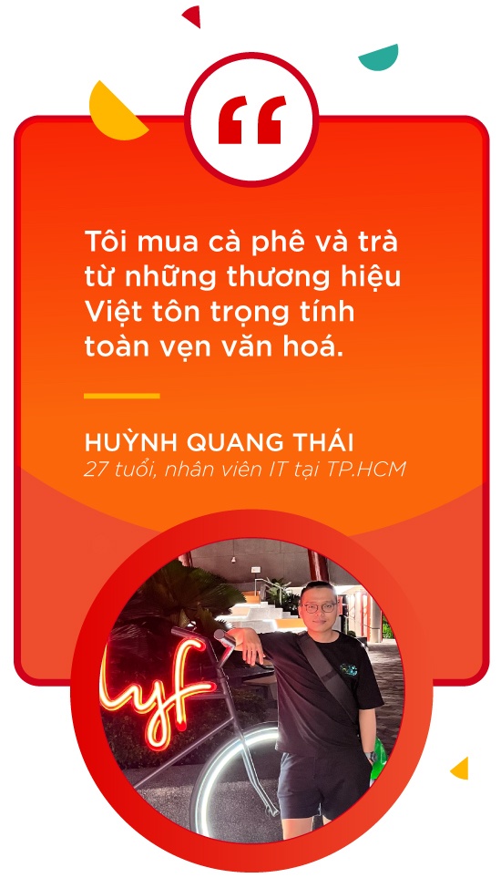 “Là người trẻ, tôi sẵn sàng mua cà phê và trà từ những thương hiệu Việt tôn trọng tính toàn vẹn văn hoá, thậm chí sẵn lòng trả tiền cao để đổi lấy sản phẩm chất lượng. Với tôi, đây là cách góp sức để nhà sản xuất đặt nhiều tâm huyết vào sản phẩm của họ”, anh nhận định.