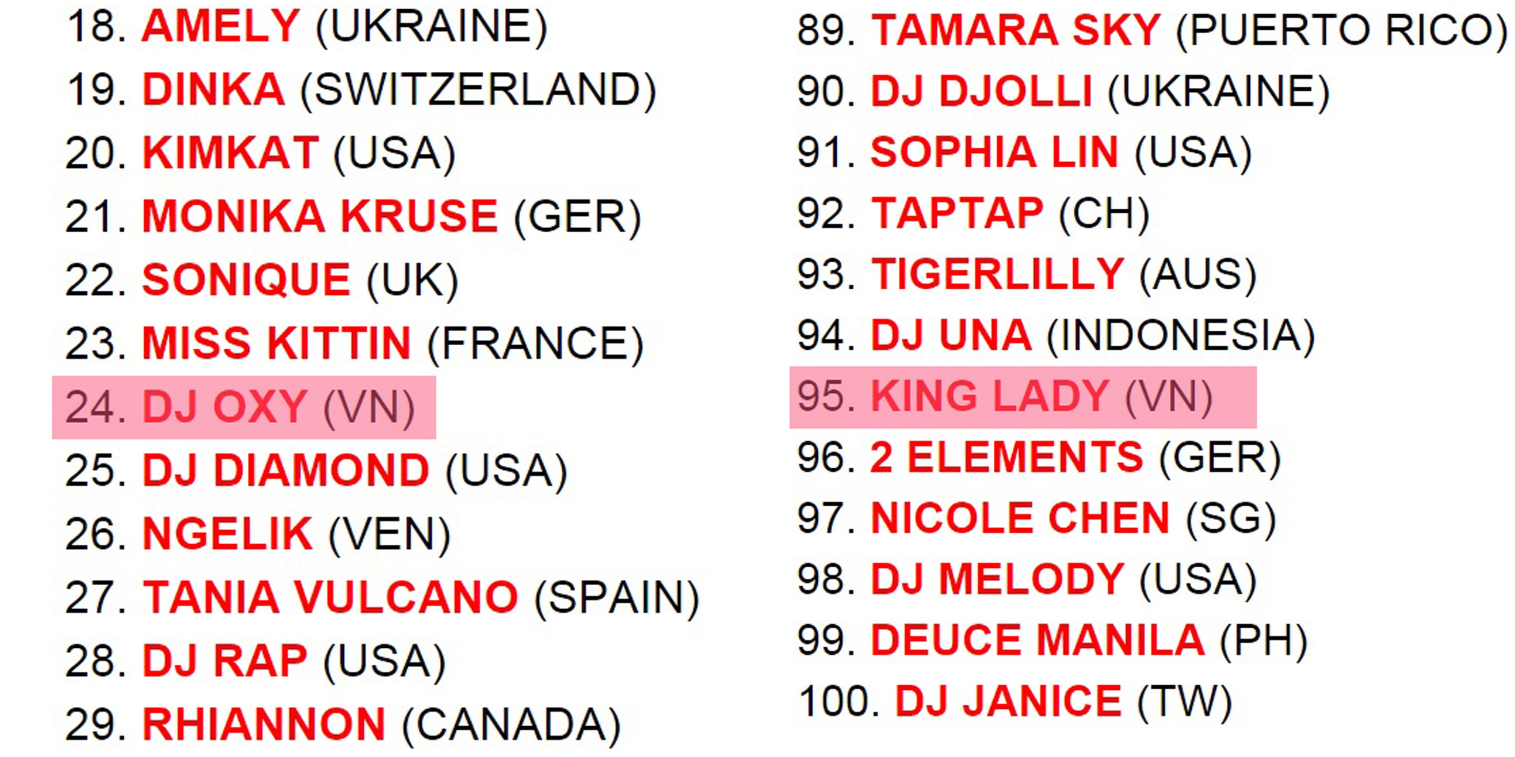Vừa qua, trên Thefdjlist.com - chuyên trang về DJ được sở hữu bởi nhiều công ty truyền thông, đã công bố top 100 DJ nữ hàng đầu thế giới. Đại diện cho Việt Nam góp mặt trong danh sách này có DJ Oxy (Cù Thị Ngọc, SN 1993, quê An Giang), King Lady (SN 1993).