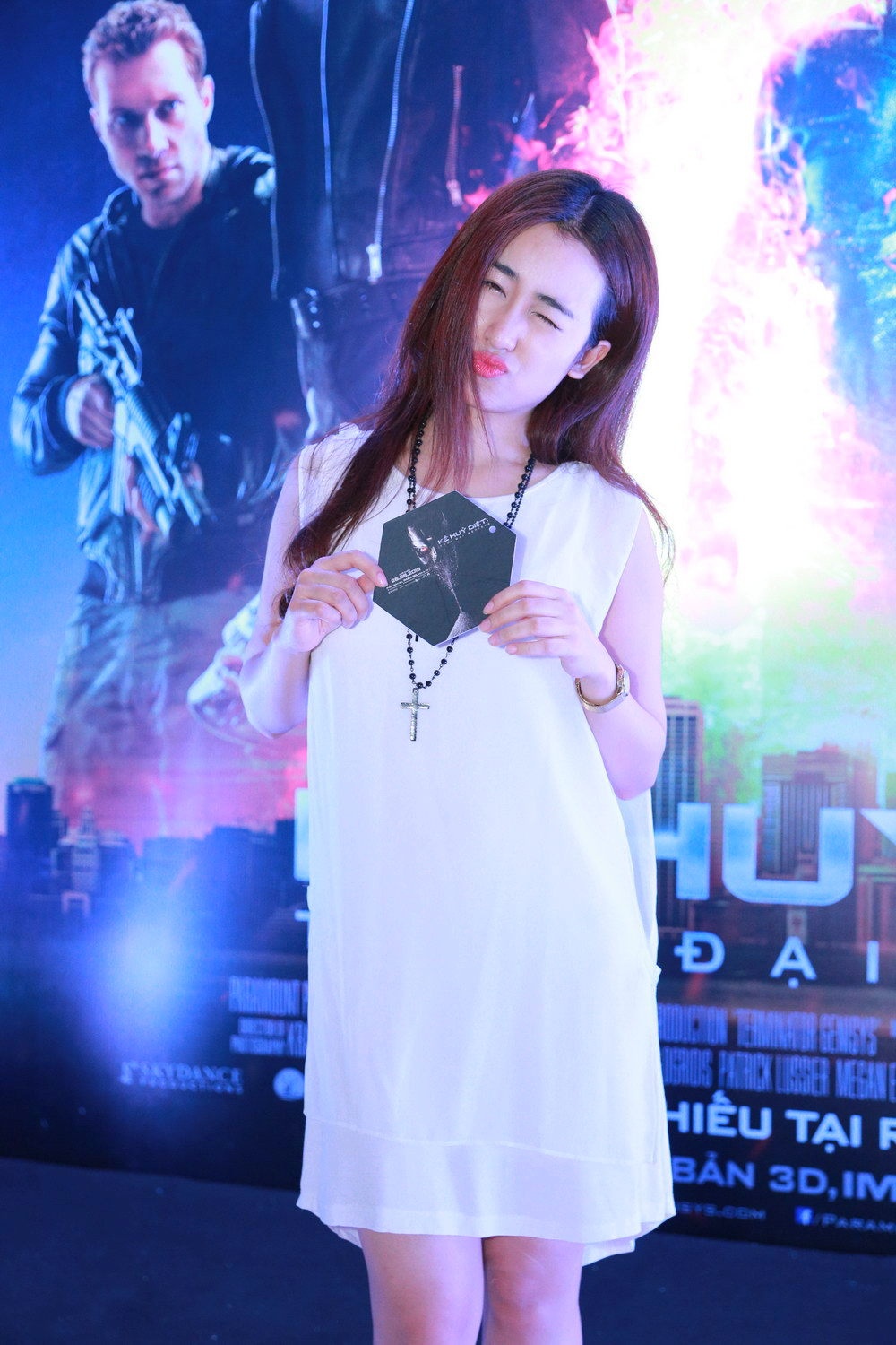 | Trang Moon có mặt khá sớm tại buổi họp báo phim. Nữ DJ 9X diện váy trắng và tạo dáng nhí nhảnh trước ống kính. |