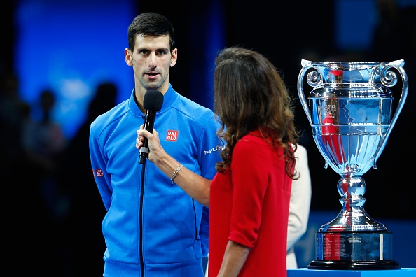 Ngôi sao người Serbia vinh dự nhận chiếc cúp dành cho tay vợt nam số 1 thế giới sau khi xuất sắc vượt qua Kei Nishikori ở trận ra quân tại ATP World Tour Finals.