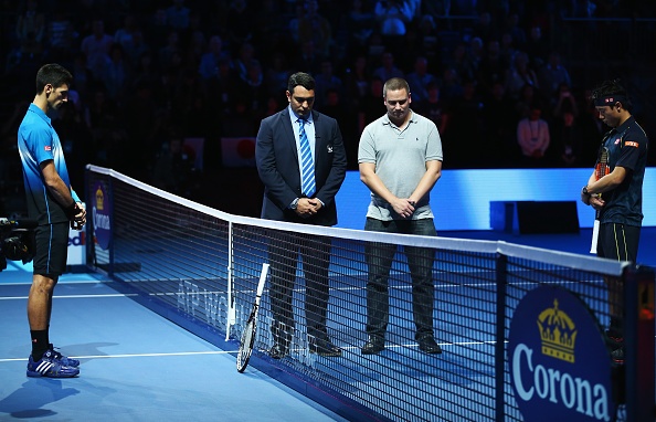 | Trước khi trận đấu diễn ra, ban tổ chức, hai tay vợt và khán giả có mặt tại nhà thi đấu The O2 (London) dành một phút mặc niệm các nạn nhân xấu số ở vụ thảm sát Paris hôm 13/11. |