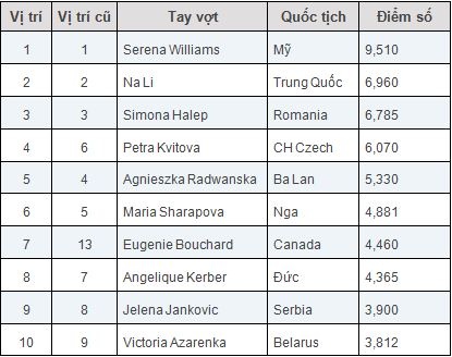 *Top 10 tay vợt nữ hàng đầu thế giới
