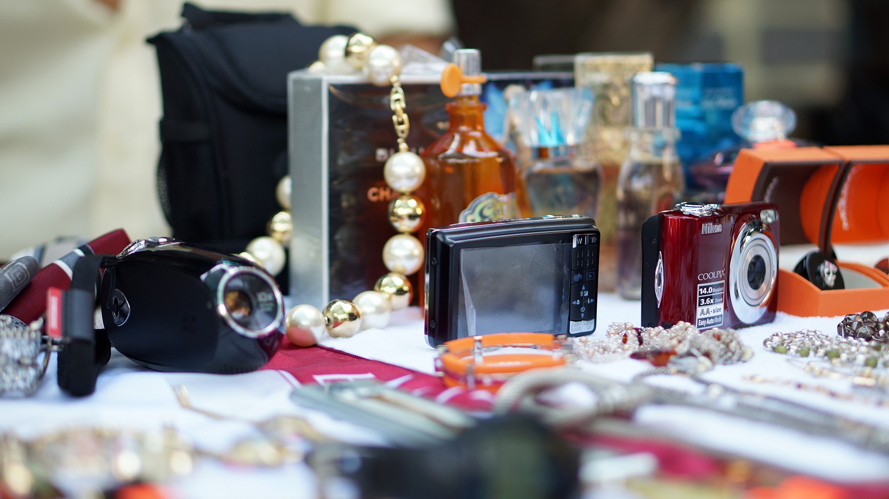 | Máy ảnh số, máy quay số sản xuất từ vài năm trước nằm lẫn với nữ trang, đồ lưu niệm. |