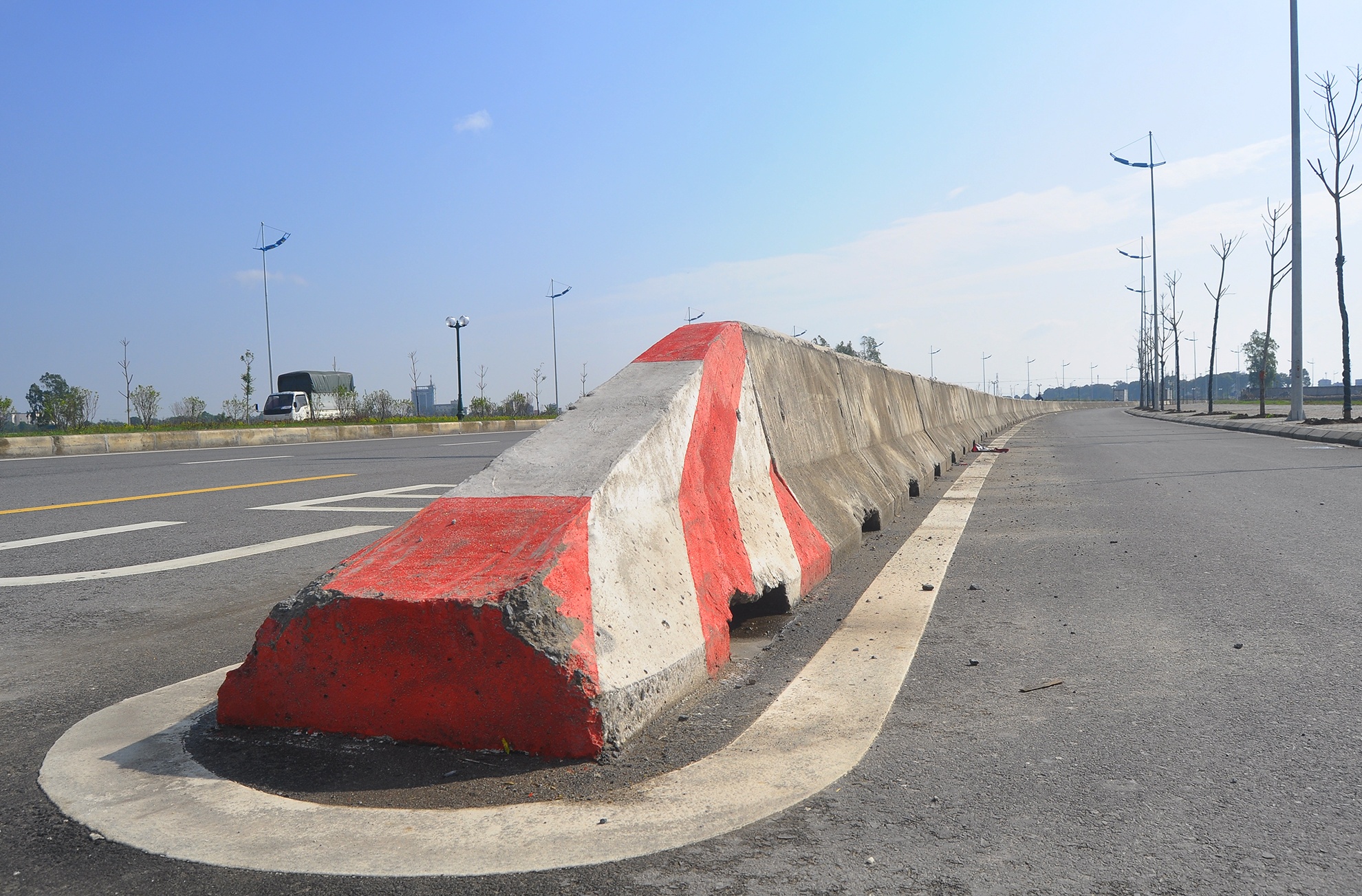 | Phần đầu mỗi đoạn dải phân cách thiết kế vát chéo rất thấp và không có biển báo phân làn phương tiện là một nguyên nhân dẫn đến hàng loạt sự cố lật nghiêng xe trên cao tốc Võ Nguyên Giáp. Ảnh: Hoàn Nguyễn |