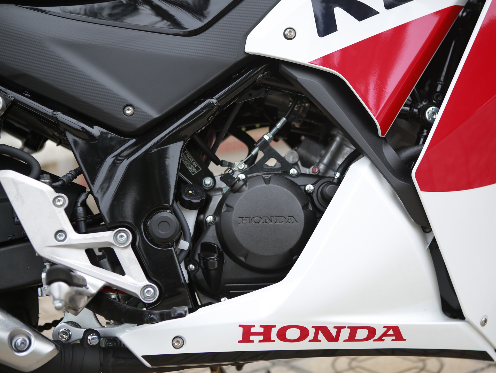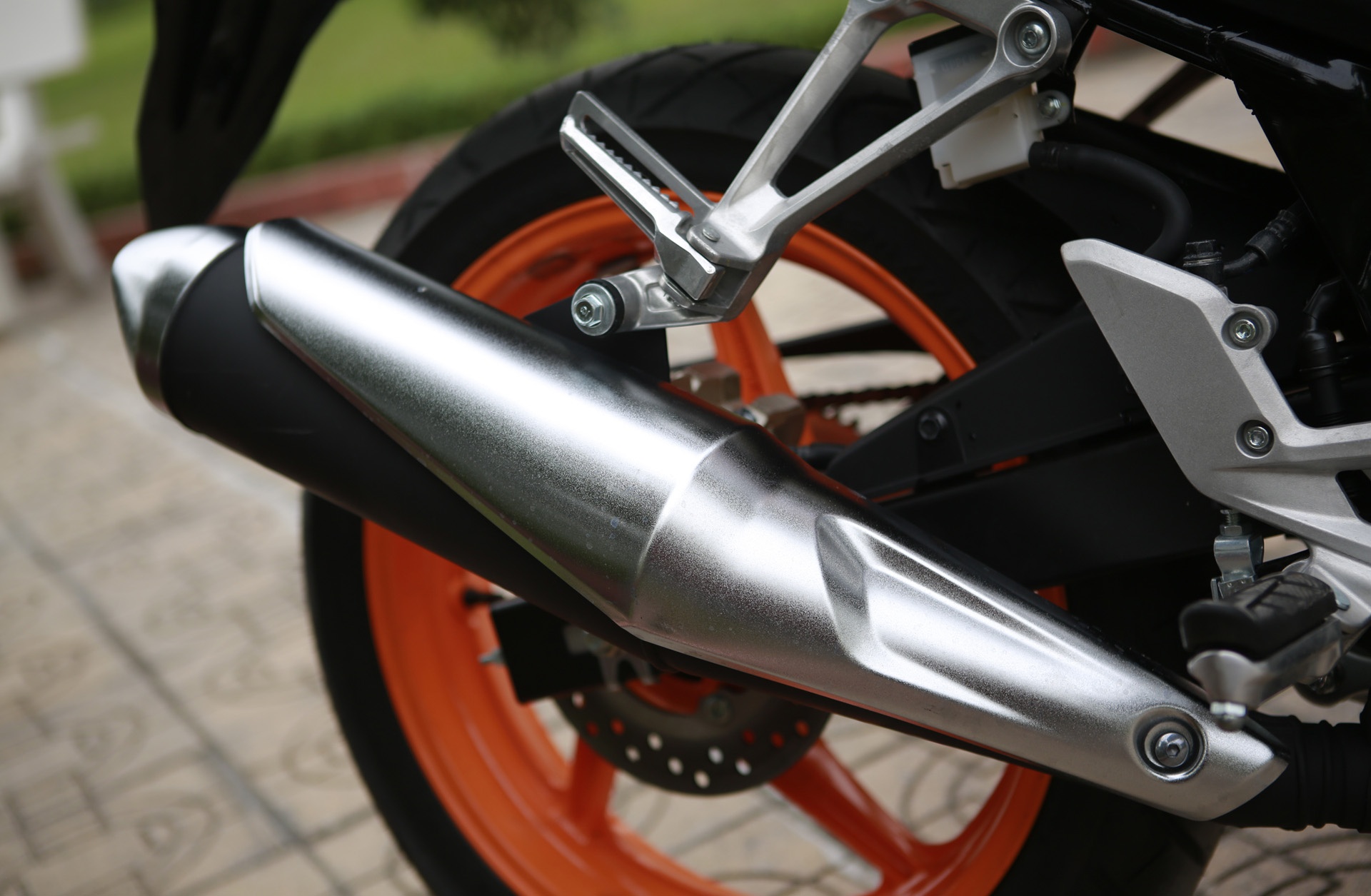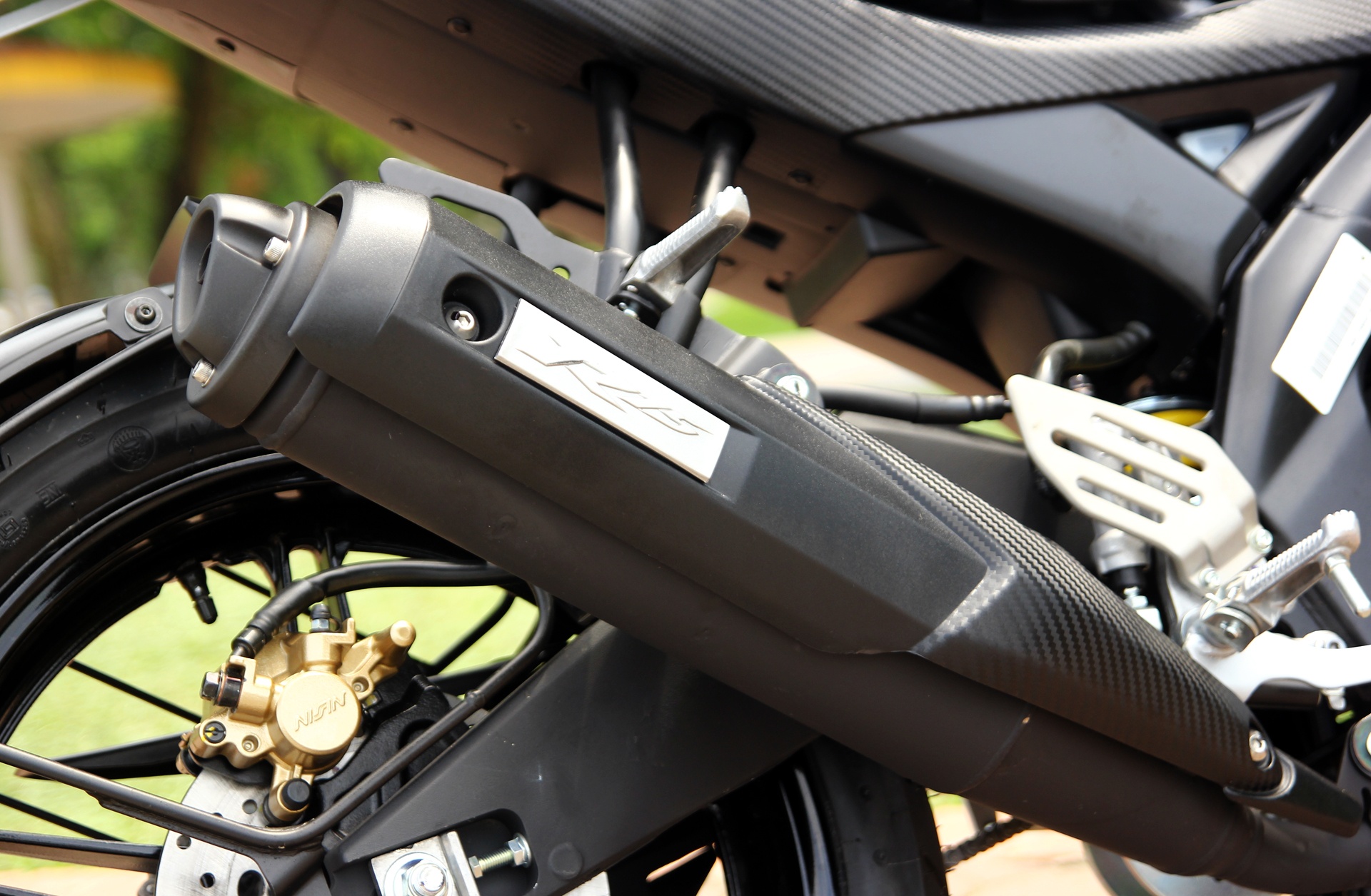 | Ống xả CBR150R được ốp bảo vệ bằng kim loại, trong khi Yamaha R15 dùng ốp bảo vệ nhựa. |