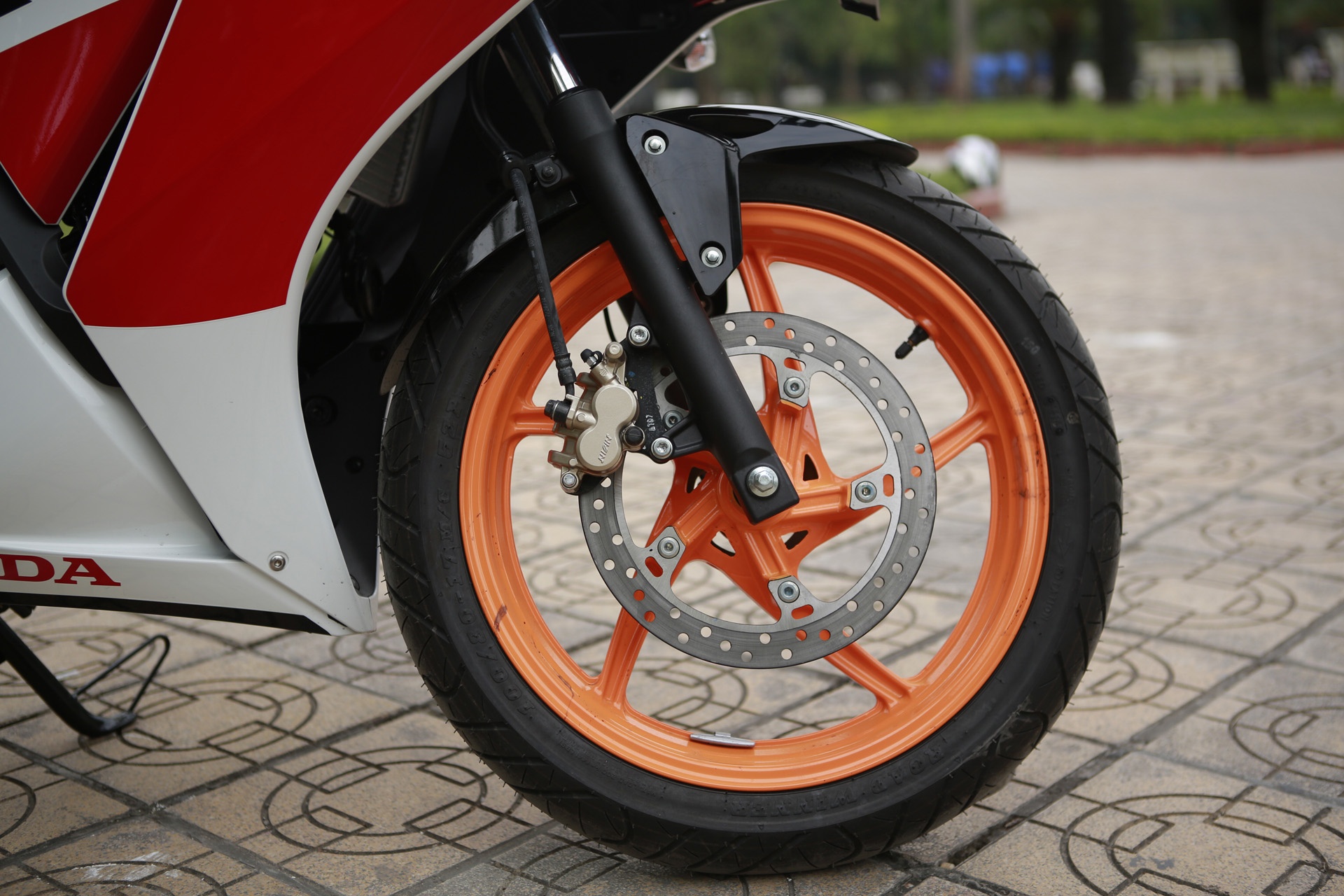 | Yamaha R15 sử dụng vành xe 5 chấu đôi, trong khi CBR150R dùng vành xe 5 chấu đơn, cùng kích thước 17 inch. Trang bị an toàn phía trước là hệ thống phanh đĩa thủy lực. Bánh trước Yamaha R15 kích thước 90/80-17, trong khi CBR150R dùng lốp kích thước 100/80-17. |